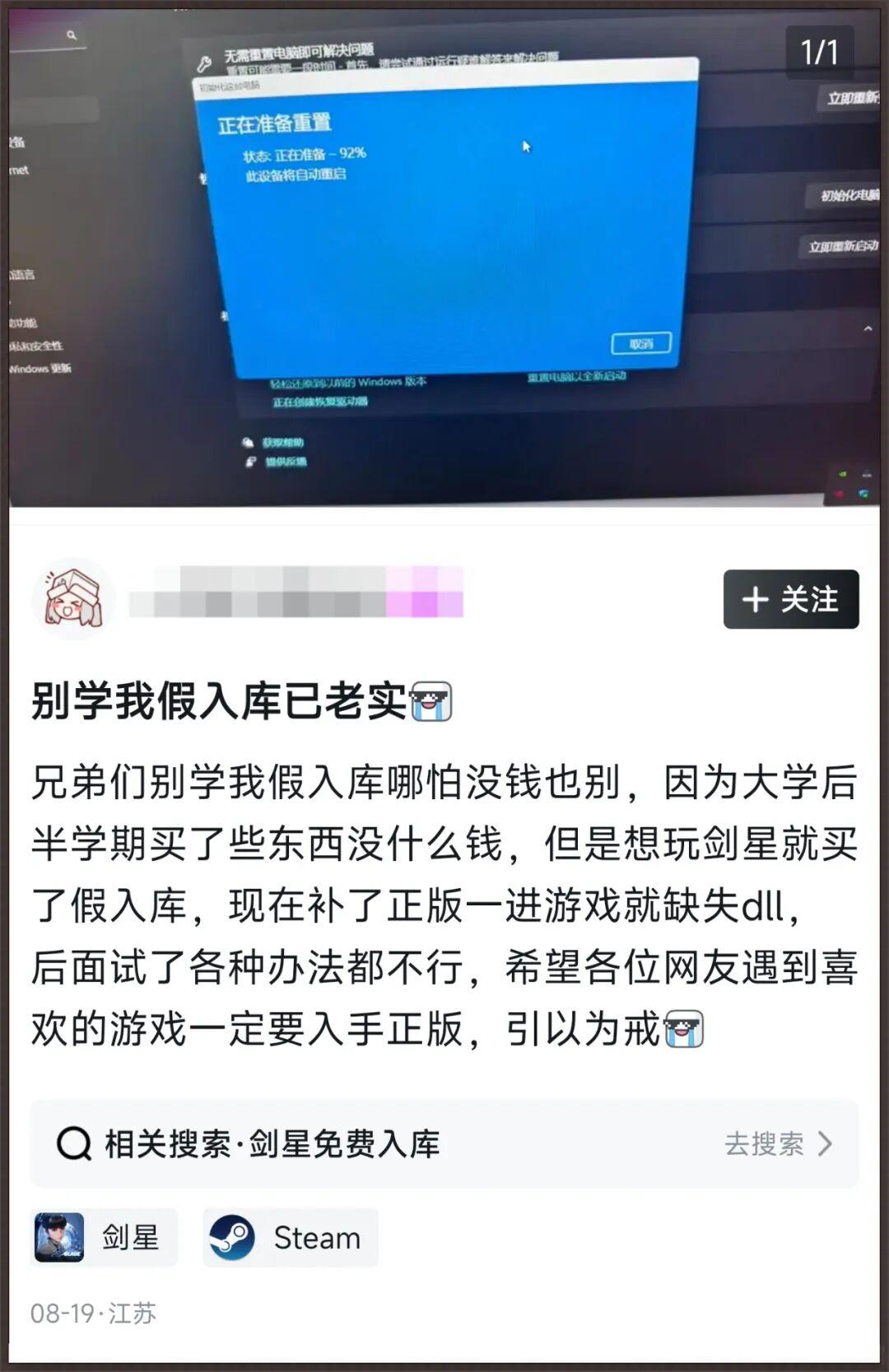 我在小黑盒上看到不少老哥,發現自己中招後,趕緊補買了正版。結果因爲電腦上殘留的腳本沒清理乾淨,正版遊戲也被誤認成假入庫,無法正常運行。