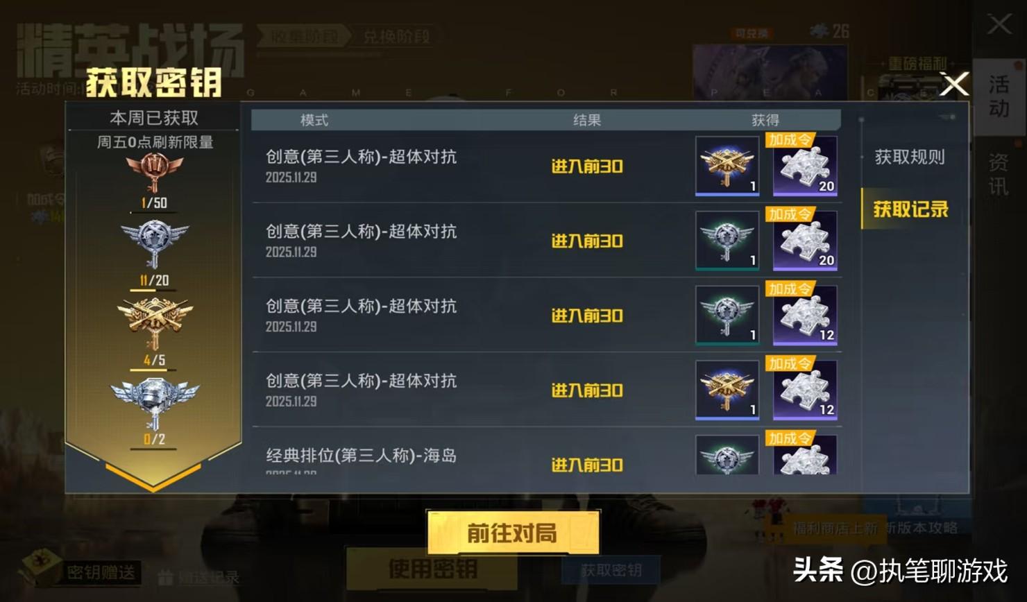 首先是前期的2個小時尤爲重要,“肝神”玩家打了一局主題海島,又打了一局主題雪地,結果發現時間太久,而且高等級的密鑰概率較低,於是就劍走偏鋒,想起了沙漠裏的“飲料機”,簡單的幾局遊戲下來,還真給拿到了不少徽章,其中就包括3級密鑰、4級密鑰。