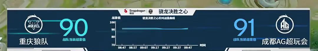在比賽的關鍵時刻,屏幕下方會彈出名爲“驍龍決勝之心”的數據面板。它將對陣雙方的狀態進行了同步可視化的對比——除了有實時跳動的,涵蓋專注、開心、抗壓等維度的五維雷達圖,還會呈現出隨時間變化的戰意值曲線,還原兩支戰隊在這一時間段內的心理博弈走勢。
