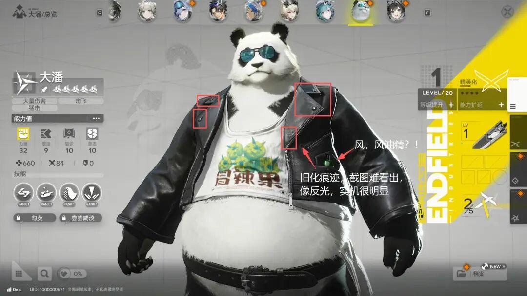 遊戲裏,熊貓的那件皮衣,不僅五金建模質感優秀,甚至還在領口和袖口,做出了經典的皮革舊化痕跡。這是很冷門的細節,但它就是出現了。