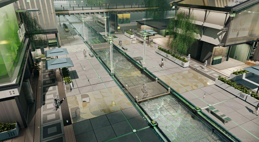 那連接二者的又是什麼呢?是設計高級的人造瀑布。遠方高塔上,細長的瀑布使水流從一條線流下,隨後,水流穿越整個武陵城,慢慢分割成遍佈城市的一條條分支,這是在模仿瀑布流下山體。而水流的主幹,則一路沿着主幹道,從遠方高塔的至高點,延續至你面前的,代表塔底的池中雕塑。