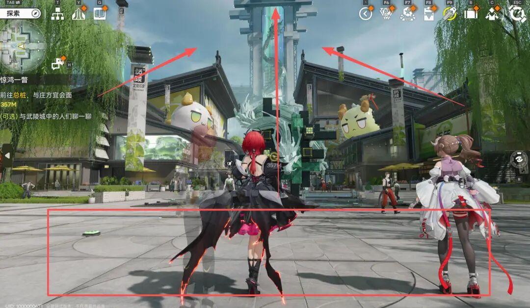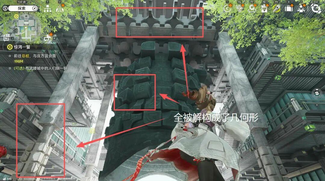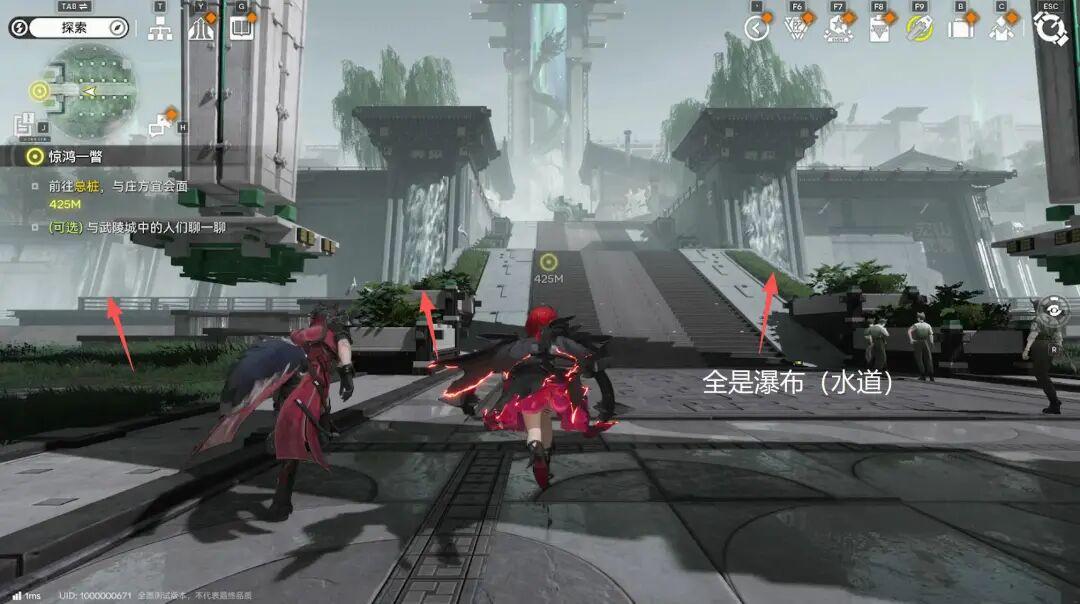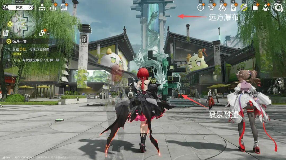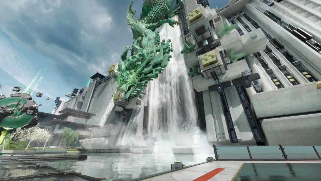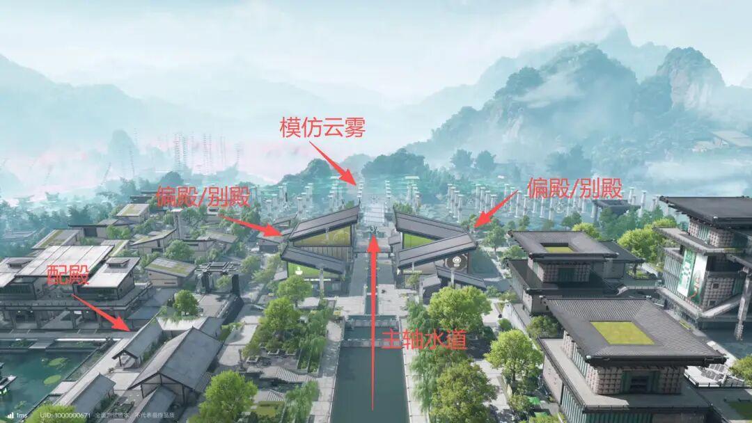 這片區域裏,遠方那座被青龍盤繞的瀑布,明顯構成了主軸。同時商圈裏的兩棟梯形樓房,像護法一樣站在主軸兩側,屋頂斜度將視覺重心引向主軸,這三者前方,則是大片空地,也是玩家進入時的站位。
