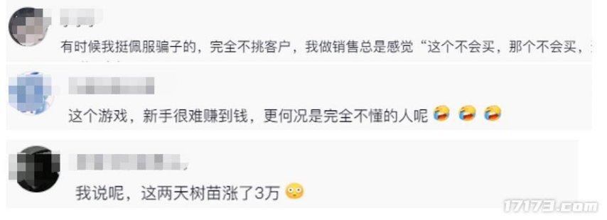 對此有曾經做銷售的網友感慨,有時候挺佩服騙子的,完全不挑客戶。也有熟悉遊戲的網友直言,這遊戲新手很難賺錢,更何況是完全不懂的人。還有夢幻玩家調侃,我說這兩天遊戲裏的樹苗怎麼漲了3萬。