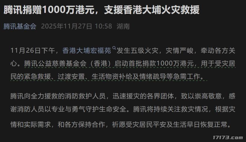 上週,中國香港大火的消息讓不少人都十分揪心,如今遊戲圈的多家企業已經開始捐款馳援中國香港火災。