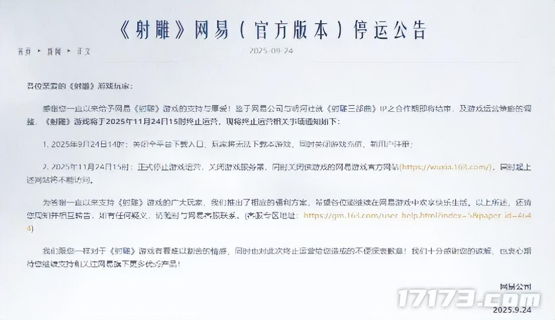 曾宣傳自己150年長線運營,要賺慢錢的網易《射鵰》已經在11月24日正式停止運營了。