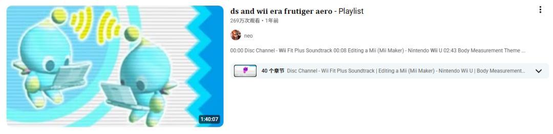 Frutiger Aero不僅限於視覺設計,音效對其美學體系的構建同樣功不可沒。而在各大平臺的歌單裏,任天堂 Wii、DS時代的菜單以及遊戲音樂成爲了Frutiger Aero音樂的重要組成部分。