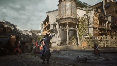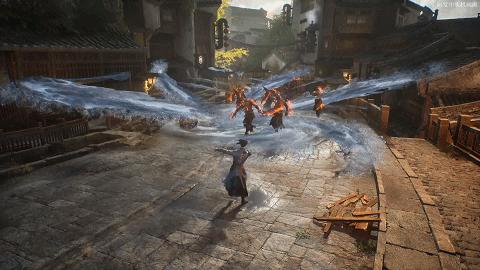 不難看出,遊戲很強調模擬物理效果的玩法。吳自非告訴我,演示裏那個拉倒水塔沖走敵人的橋段,並非預製的過場動畫,而是實時的流體物理運算。未來他還希望水流能根據地形產生真實的反饋,比如說在平地便會攤開,在狹窄的巷道中則會積蓄水位。當然,這要實現起來肯定不容易。