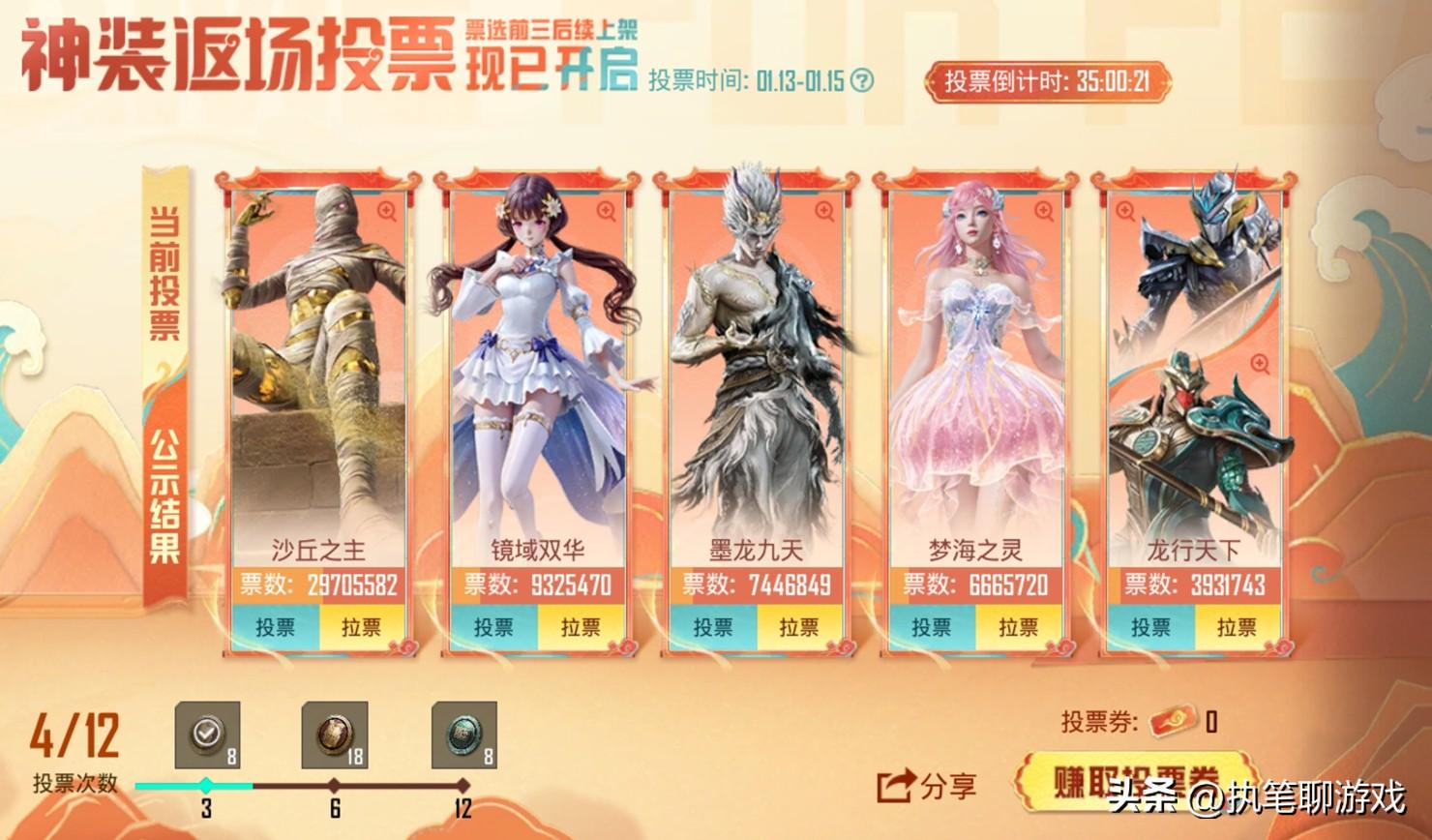 然後是大家比較關心的數量方面,紅裝第一次返場出現6套,分別是圖卡盟、歐若拉、水母、墨龍、關羽、趙雲,最後採用票選前三的規則,最終返場出現的是圖卡盟、歐若拉、墨龍。