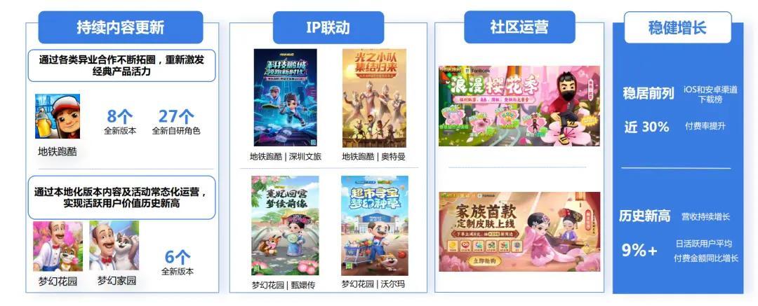 你看我們的《地鐵跑酷》《機甲戰隊》《夢幻花園》,雖然我們是發行方,但也深入遊戲,推出了我們自己的原創角色,並取得了不錯的商業化成績。