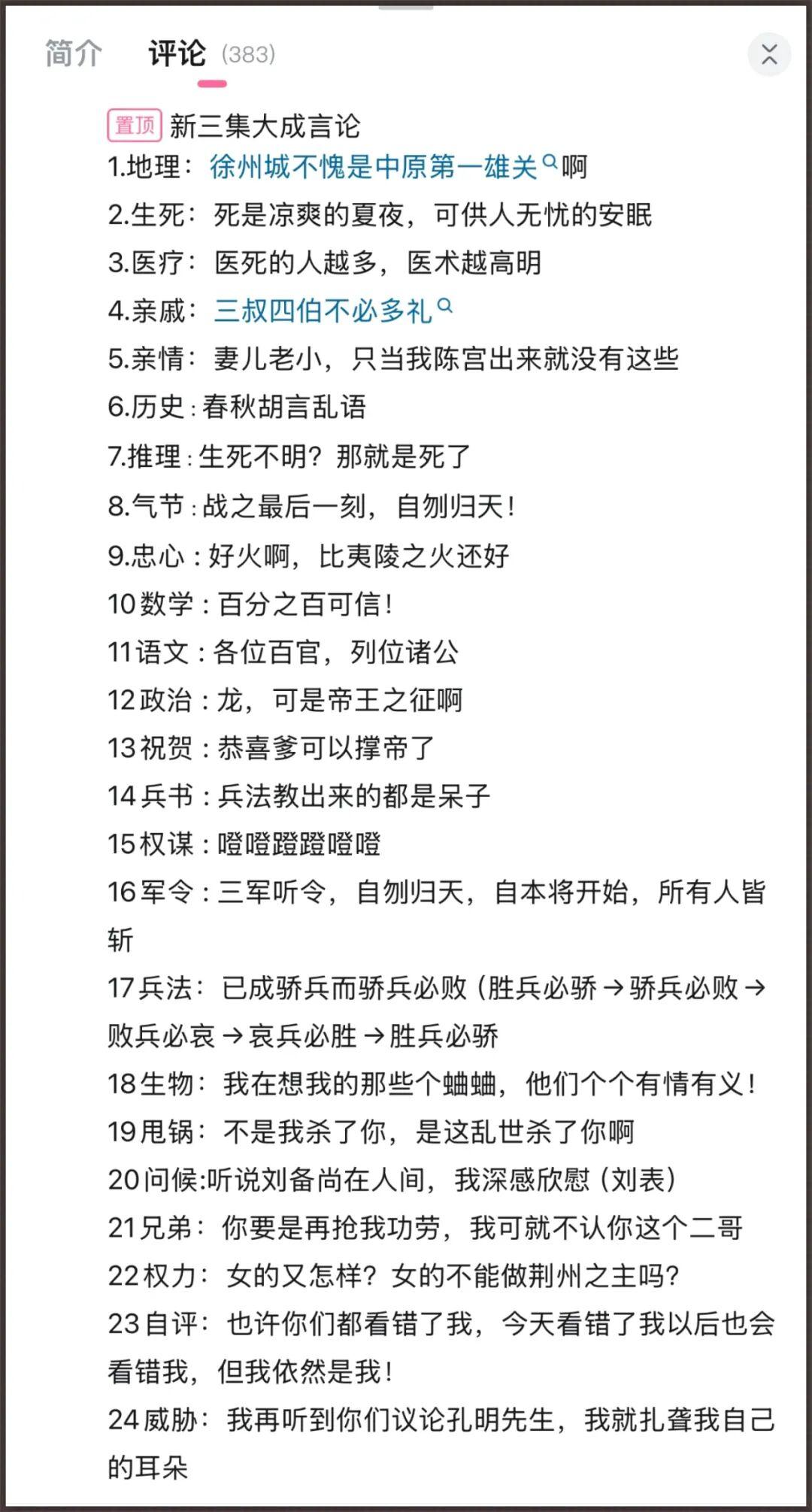 隨之爆火的還有“新三國語錄”,你可能在抖音B站刷到過類似的神經兮兮的定型文評論,但一直沒有注意,其實都出自新三國。