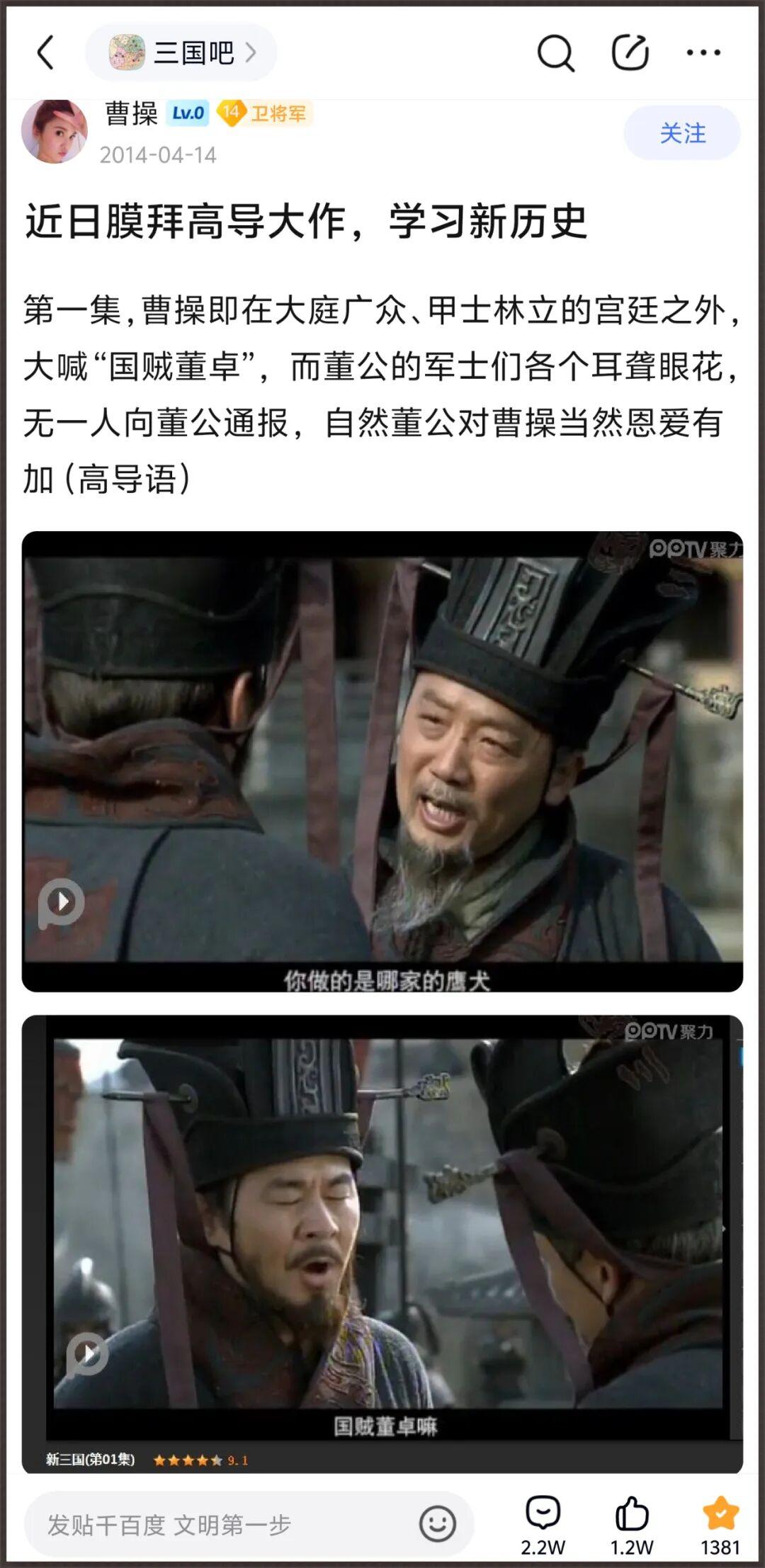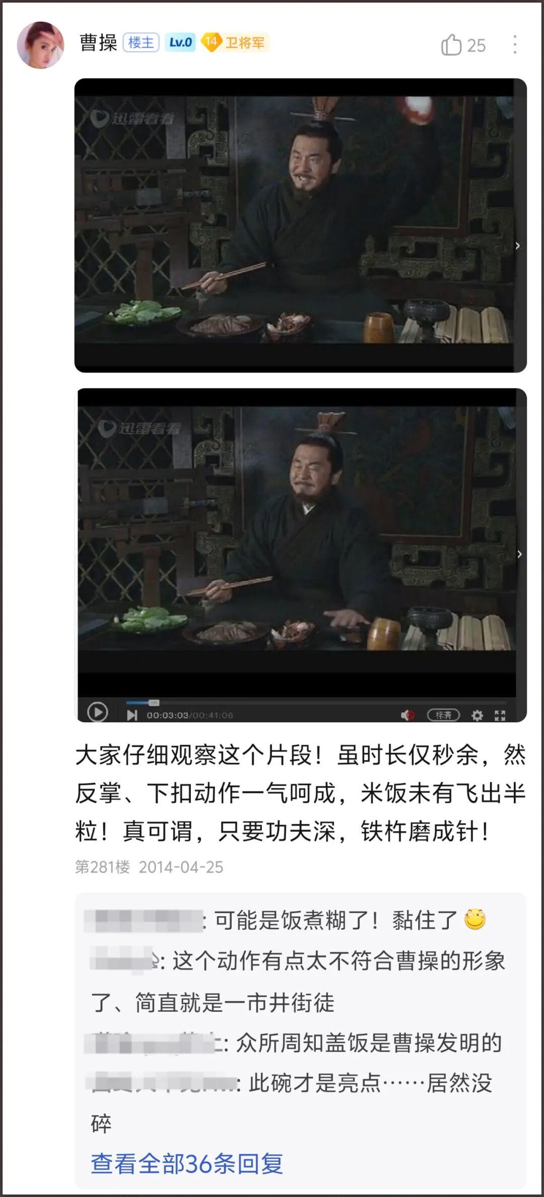 2014年的時候,貼吧就有一位神ID“曹操”的吧友開了個吐槽帖,一邊看一遍吐槽,什麼“全員耳聾眼花”“曹操蓋飯”,95集水了幾千樓,全程笑料不斷,跟帖無數。