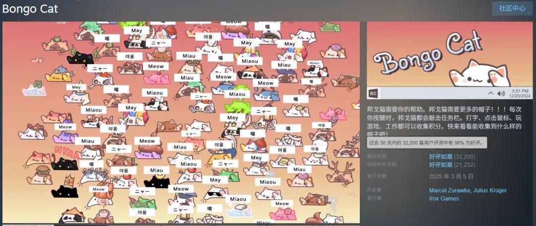 今年3月份,爆火的免費軟件《Bongo Cat》的同時在線一度高達19.4萬,更是證明了這批用戶在Steam的活躍。桌面軟件和桌面遊戲不分家,前者的興起,很大程度上給桌面放置遊戲做了預熱,提供了穩固且可觀的用戶基礎。