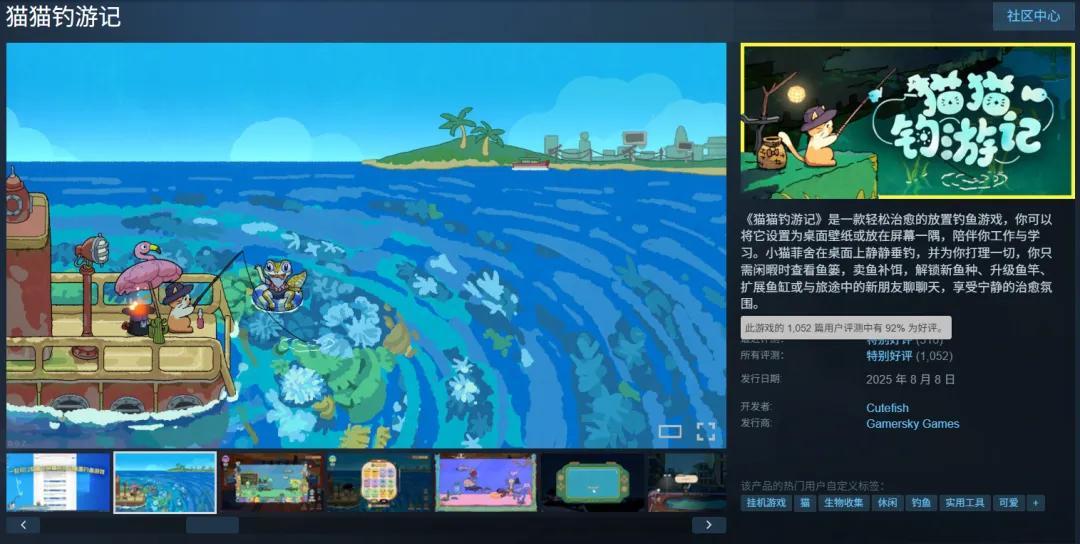 說來《貓貓釣遊記》並不是什麼大作,也沒太大名氣,如今在Steam僅有1千來條評論,不過好評率確實不錯,有92%,妥妥小衆佳作一枚。