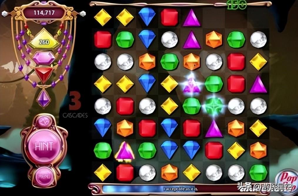 以經典作品《寶石迷陣》爲例:玩家通過互換相鄰寶石的位置來形成三個或以上相同顏色的直線,從而觸發消除並獲得分數,並以此構成進入下一關的具體標準。這種“兩兩交換,同色消除,連鎖反應”的簡明邏輯與操作,也同樣成爲了適應各年齡段的休閒玩法代表。