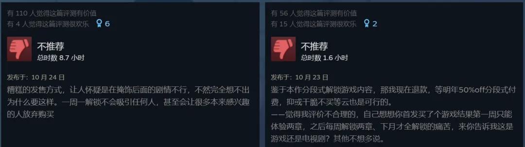 在10月下旬《超英》上線之初,我看着遊戲在中文區偏低的好評率,一度懷疑它能在Steam全球熱銷榜上待多久。這款遊戲採取了分集釋出內容的發售方式,而就早期的評論來看,大多玩家並不能接受這點。