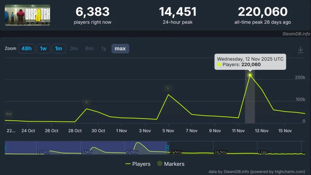 就數據來看,AdHoc這招拆集策略,確實打出了相當好的效果:在8集內容全部釋出前,《超英》穩居Steam全球熱銷榜前列,說明不斷有新玩家在入坑;據SteamDB,《Disptach》的同時在線人數峯值,也是隨着內容釋出而逐漸增高的,說明遊戲沒有一波流,反而越來越火。