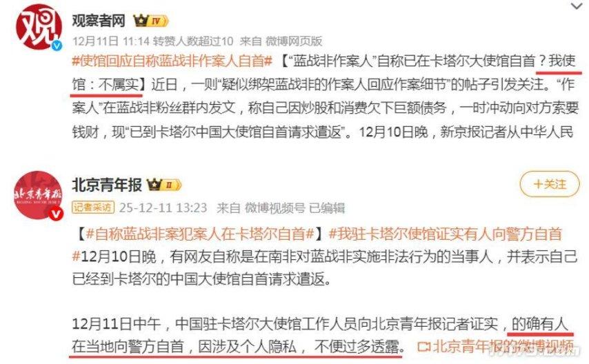 到了11日中午,中國駐卡塔爾大使館工作人員表示,的確有人在當地向警方自首,因涉及個人隱私不便過多透露。