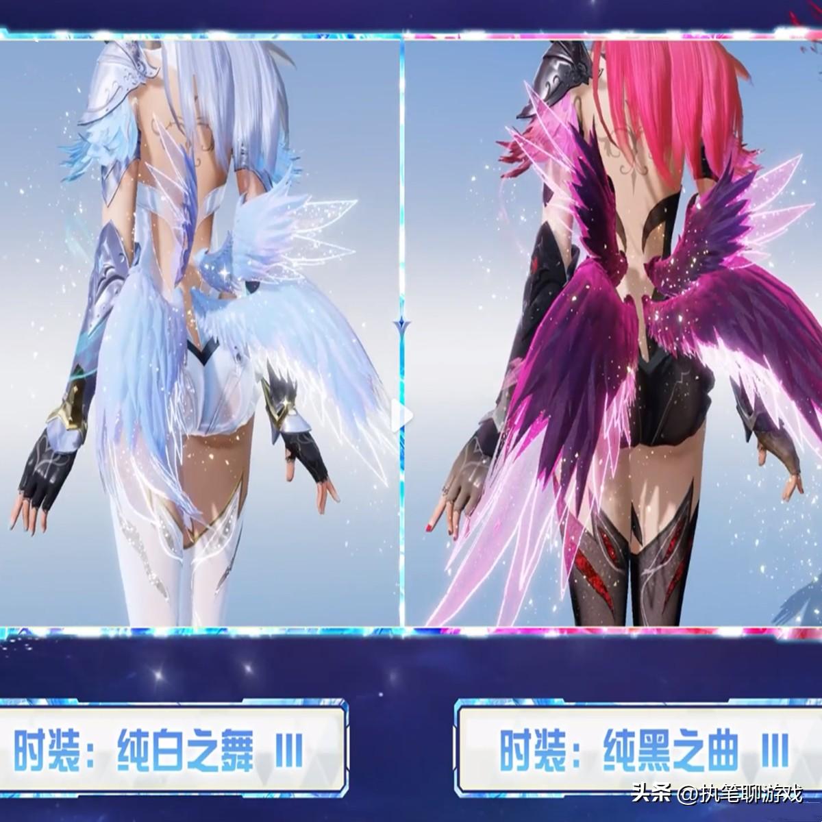 一個叫純白之舞,一個叫純黑之曲,雖然版型是一模一樣,但顏色完全不同,其中最大的亮點無疑是“腰部”長翅膀,平日裏看到過許多“背部”長翅膀,沒想到放到“腰部”也會這麼好看~嘿,天哥覺得這種有創意的設計還是相當值得借鑑的,就是不知道未來的《和平精英》裏,是否也會出現類似的創意設計吧~