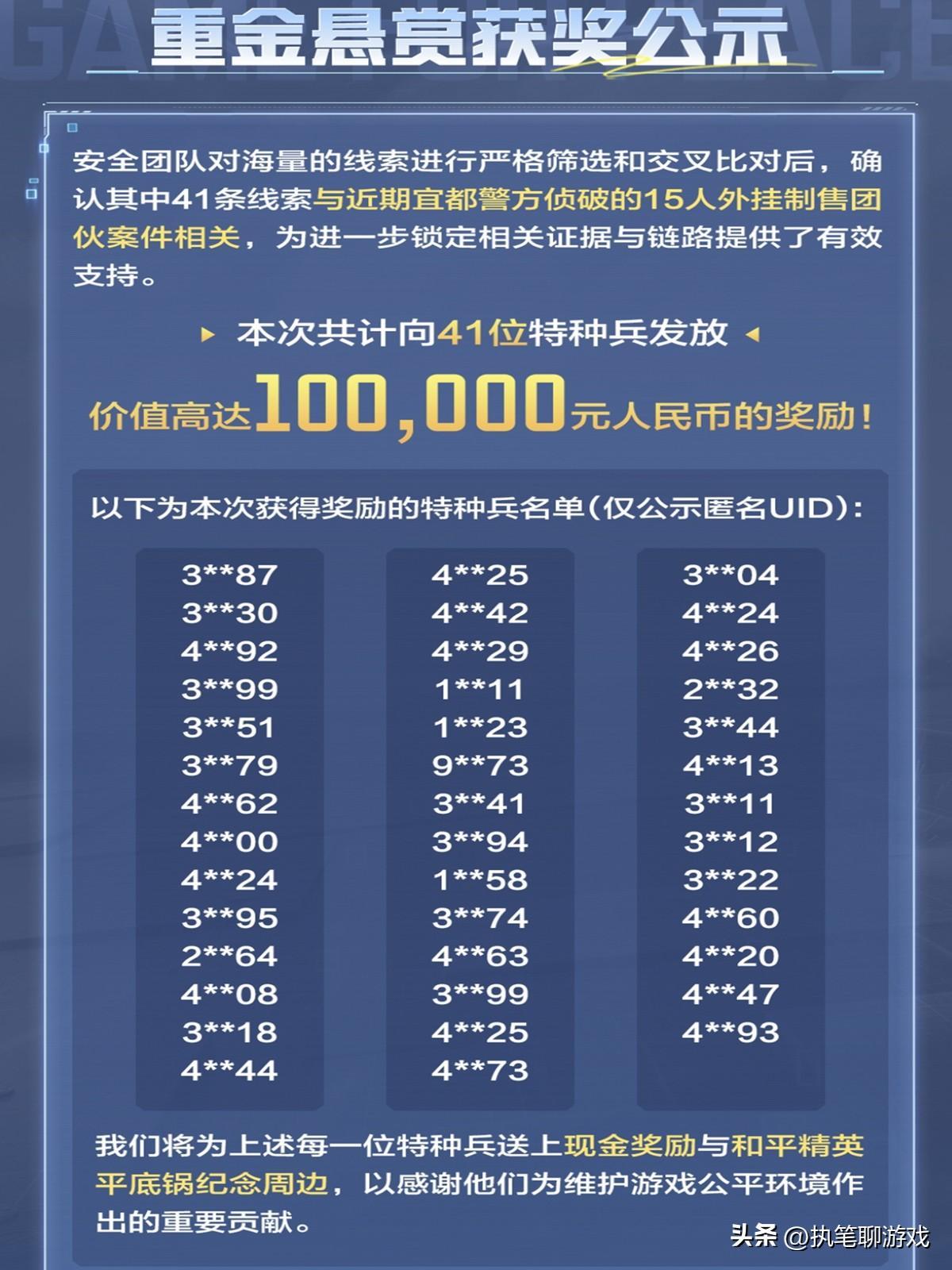 但是想要“根除”科技力量,不是想象中那麼簡單的事情,巡查、獵鷹實時等系統的助力,也讓玩家們爲公平競技的環境出了一份力,如今光子更是發出“懸賞令”,拿出10萬獎勵發給41位玩家,大快人心!