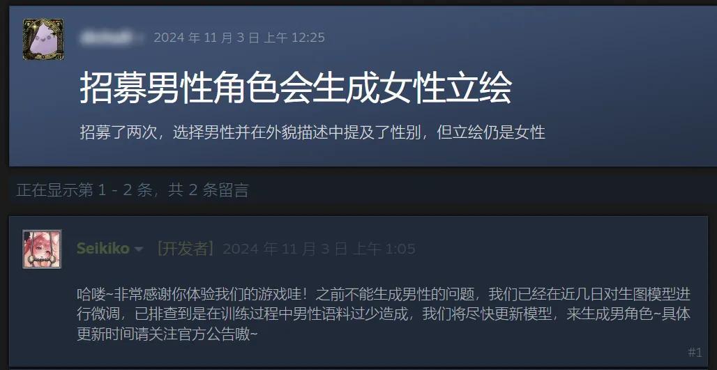 這甚至帶來了一些尷尬的體驗:受團隊遊戲設計背景和AIGC模型數據的限制,起初遊戲生成男性角色比較困難,一些女性用戶,本來想跟男角色互動,但發現生成的都是「小男娘」……我們只能手動繪製了很多男性角色來彌補訓練數據不足的情況,現在已經支持得比較好了。