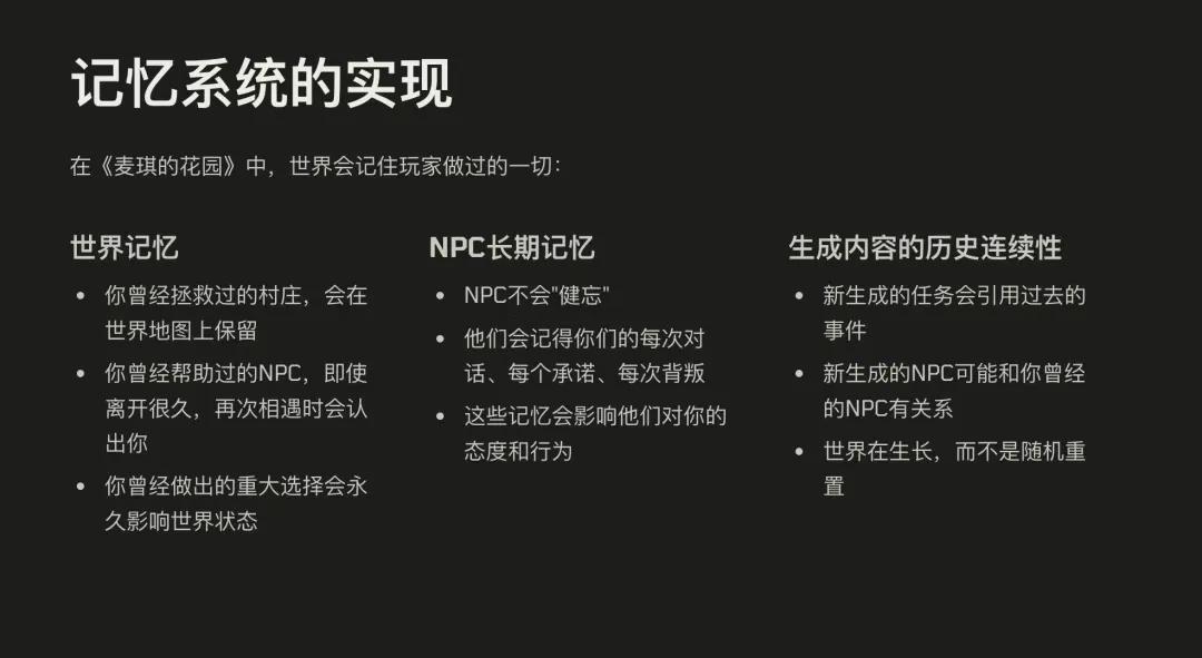 一是動態記憶系統。AI會記錄和玩家互動的關鍵事件、對話,並將其作爲未來決策和生成內容的依據。比如你今天送他一朵花,可能過幾天,他就會在新任務裏提到這件事。