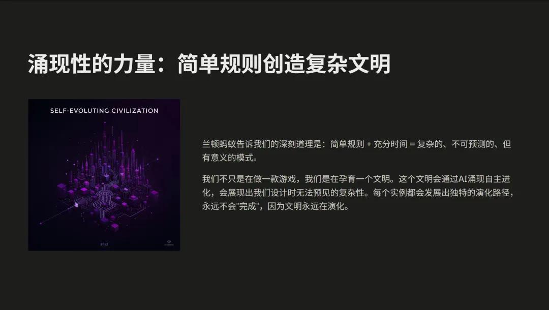 2023年,我有了一個「全要素生成」的構想,就是希望未來的遊戲,能用AI實時生成NPC、環境、玩法乃至所有素材,讓遊戲世界本身能夠自我演化,最終形成一個無需人工干預的AI UGC 生態。