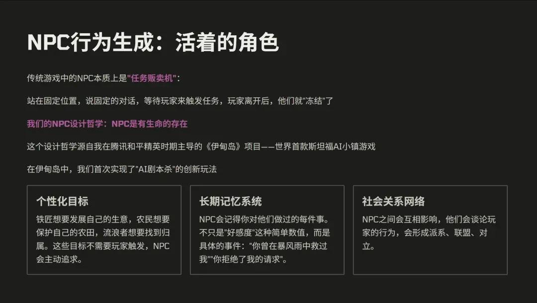 現在我可以說,沒有任何一支團隊,在AI遊戲的玩法側探索得比我們深——比如我們做的AI任務生成和玩法生成,行業裏現在僅此一家,其他團隊能做到敘事生成就不錯了。