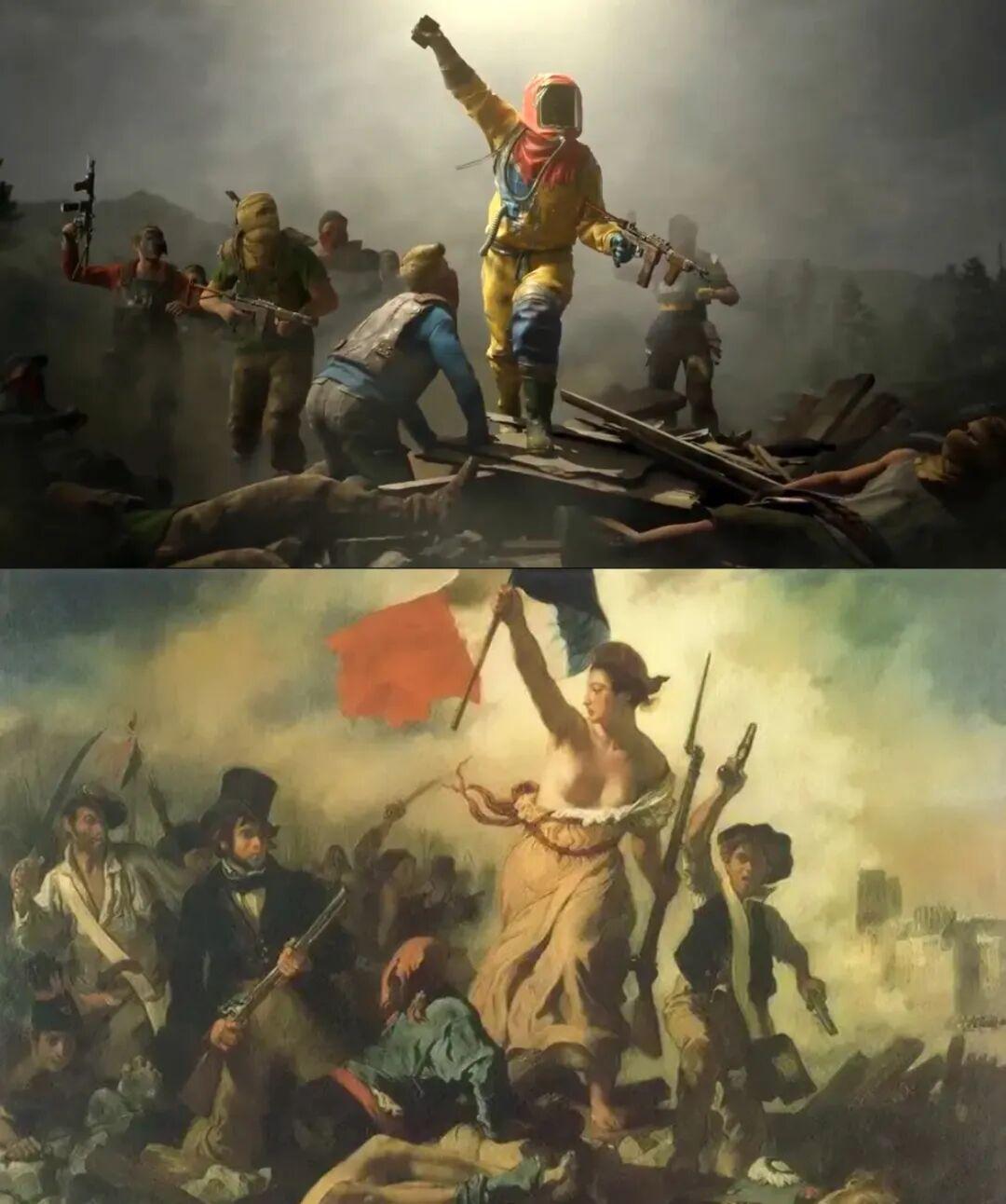 等到好不容易撿了條命,站穩腳跟,才進入正片環節。就連德拉克羅瓦鼓舞革命的《自由引導人民》,也慘遭毒手,舉旗的女神變成了手持步槍的猛男,身後跟着一羣嗷嗷叫的老鐵們。