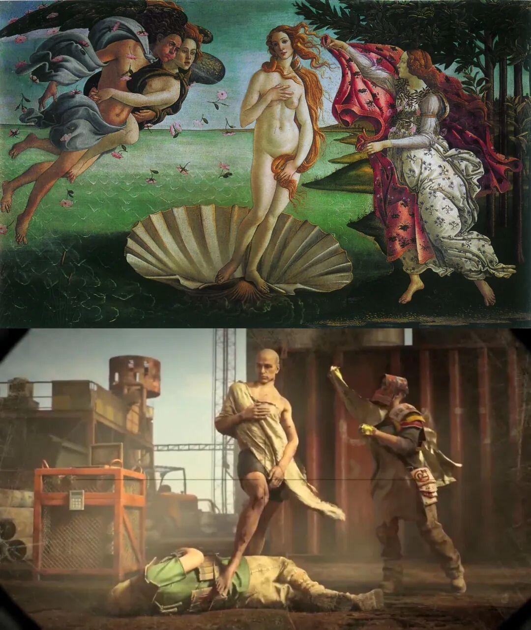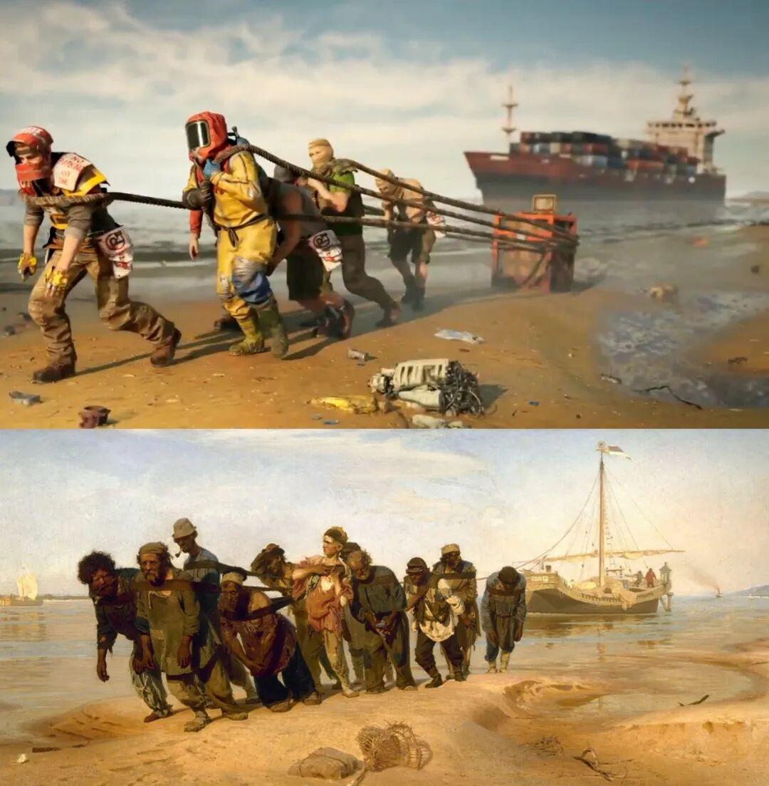 短片一開場,就定下了不講武德的基調。你以爲的生存遊戲宣傳片是肅殺、寫實?它偏不。世界的名畫與古蹟,成了這羣猛男的遊樂場。列賓的名作《伏爾加河上的縴夫》,那股沉重的苦難感,被替換成了玩家剛上島就被抓做壯丁、吭哧吭哧當苦力的黑色幽默。倒是把這遊戲的核心玩法(被人欺負)交代明白了。