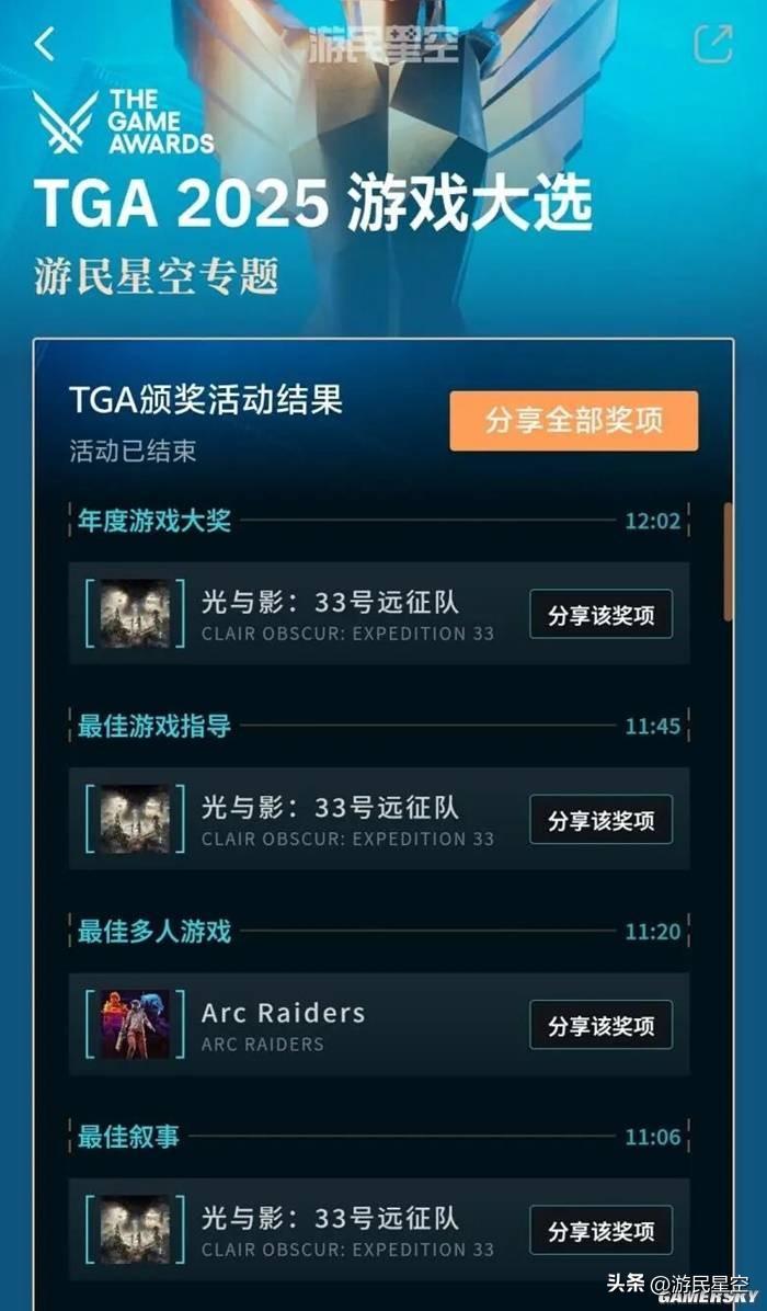 唯一讓國內玩家有點興趣的“最佳移動遊戲”,上來就被賽馬娘拿走。而回顧整場儀式,33號遠征隊包攬了幾乎所有獎項,除了玩家之聲歸於《鳴潮》、最佳多人被《Arc Riders》拿下讓我小小驚喜了一下之外,其餘的都是“哦,哦,這樣啊”以及“怎麼還是33號遠征隊”的吐槽。