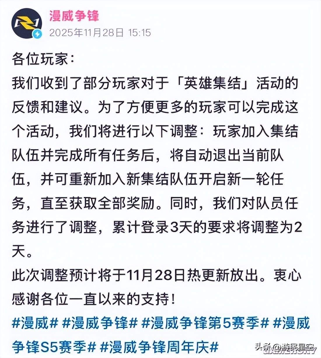 最近開的週年慶英雄集結活動,有玩家反映完成門檻高,官方也在第一時間相應,通過熱更新下調了活動的難度。不但累計登錄3天的任務調整爲兩天,並且玩家加入集結隊伍,完成所有任務後自動退隊,並且可以重新加入新的隊伍,開啓新一輪任務,直到獲得全部獎勵。從這一點上,也不難看出,官方是真的想讓更多玩家,能夠拿滿獎勵,而不是爲了達成所謂的“用戶粘性”,使勁讓玩家們爆肝。