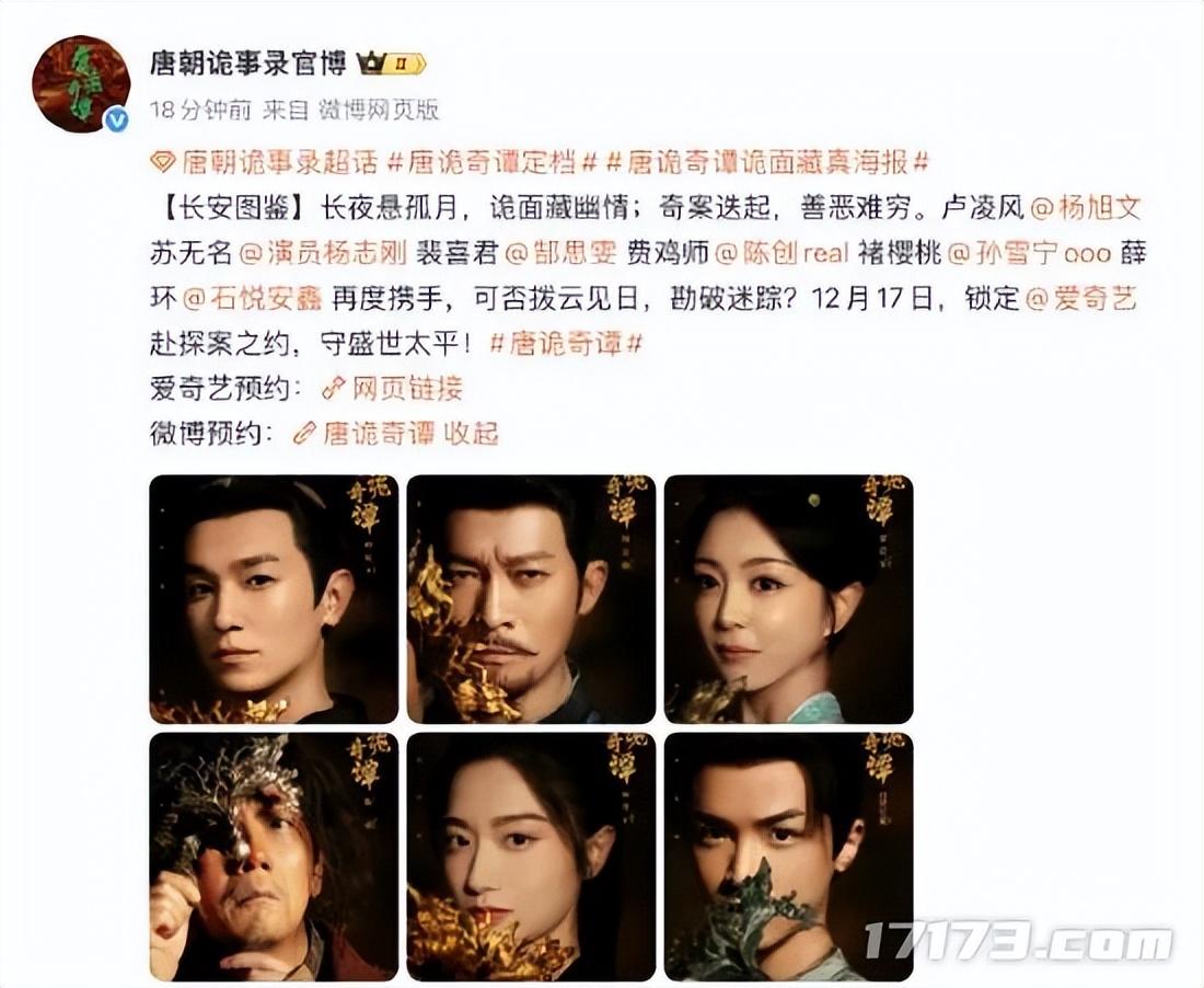 《唐朝詭事錄》新作《唐詭奇譚》定檔12月17日開播。詭面藏真版海報釋出,盧凌風、蘇無名、裴喜君、費雞師、褚櫻桃、薛環揭幕詭案。