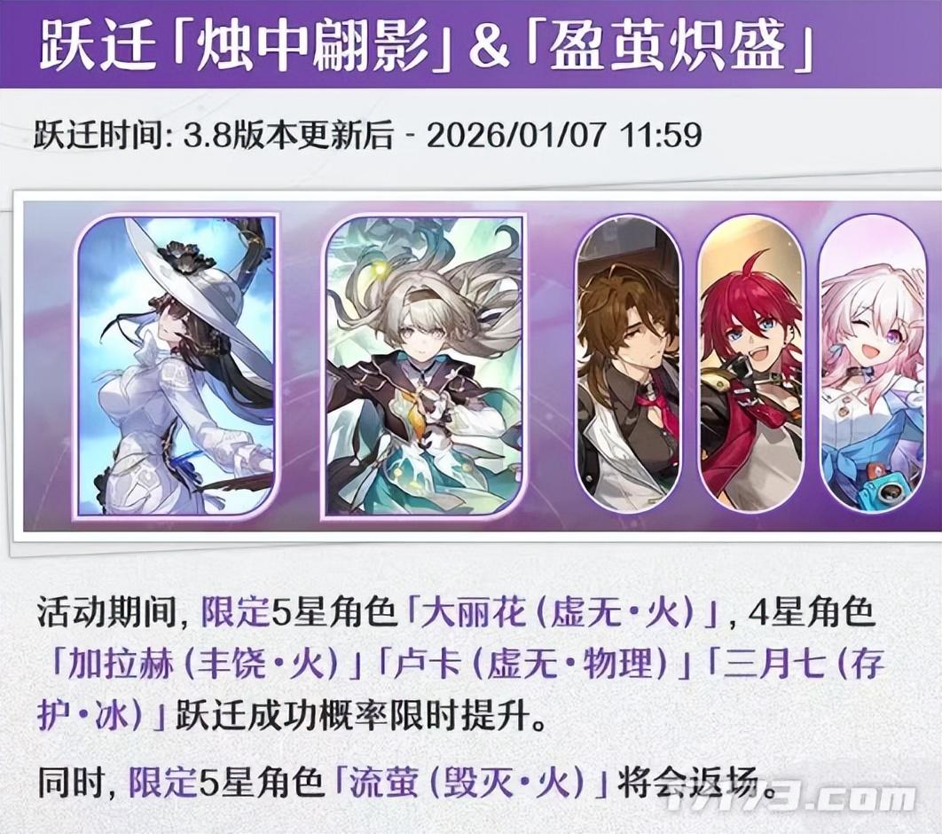 3.8版本上半卡池將會有限定五星角色大麗花和五星角色流螢,第二期則是五星角色忘歸人和靈砂。