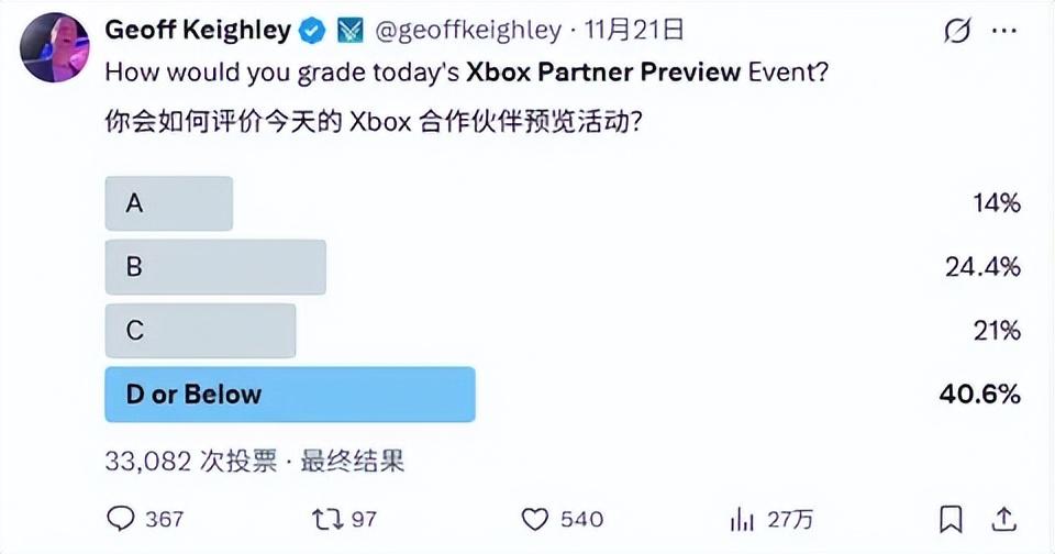 但在發佈會結束後,由TGA主持人Geoff Keighley發起的一項滿意度投票顯示,有40%的觀衆表示非常失望。