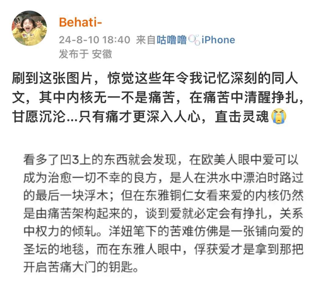 即便走出同人語境之外,這套關係模式似乎也早已與東亞敘事形成了強綁定。如今,一大批網友高喊着:“東亞人唯愛恨海情天”。