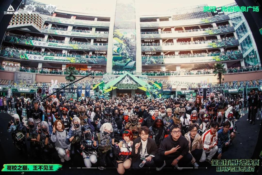 圍繞高校打洲社開展的第一屆高校賽就有200+學校報名,而落地於武漢光谷的全面打洲杯總決賽當天線下迎來了7萬多名觀衆,海南大學和濟南大學在現場開展了激烈的“雙南之爭”。與洲文化相關的互動攤位、特色周邊、coser巡遊也都點燃了火爆的現場氛圍,真正成爲了一種三角洲的派對文化。