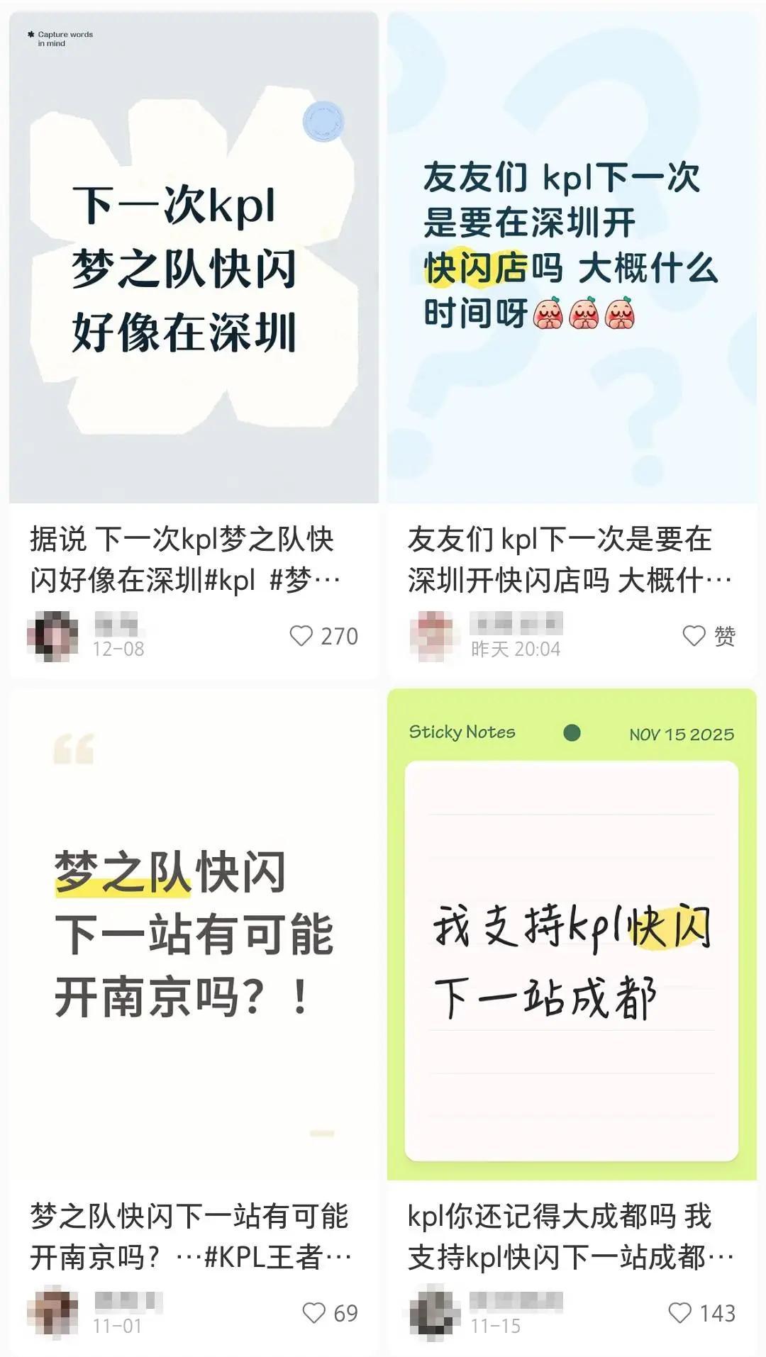 所以你才能看到,上海和北京的活動一結束,小紅書上就立馬湧出了一大堆帖子,全是其他城市的粉絲在猜測、喊話,都希望KPL能在自己的城市辦一場。