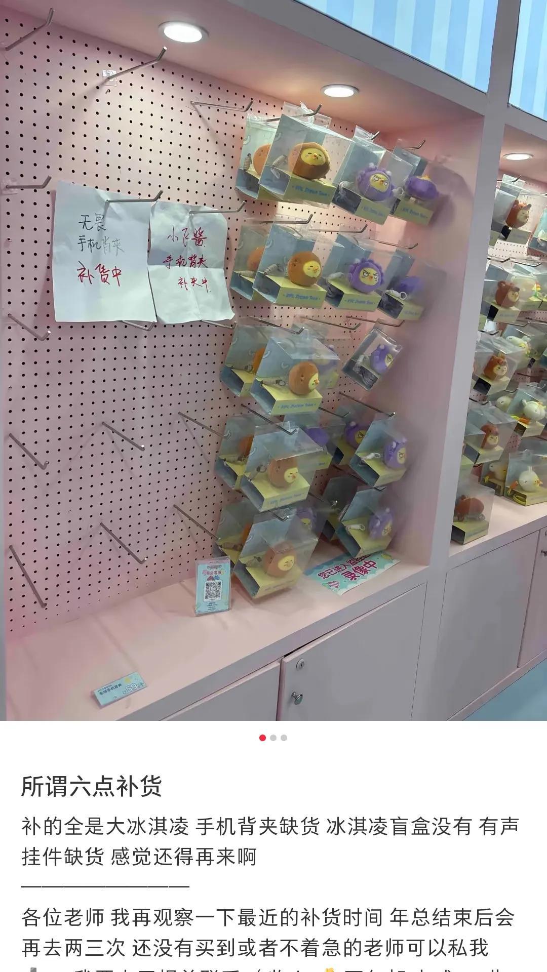 店裏面,貨架上的手機背夾、冰淇淋盲盒(冰淇淋樣式的毛絨夢嘰公仔,不是真的冰淇淋)經常秒空。爲了防黃牛,現場最火的時候甚至要答對題目才能剁手,但工作人員補貨的速度還是追不上粉絲的手速;