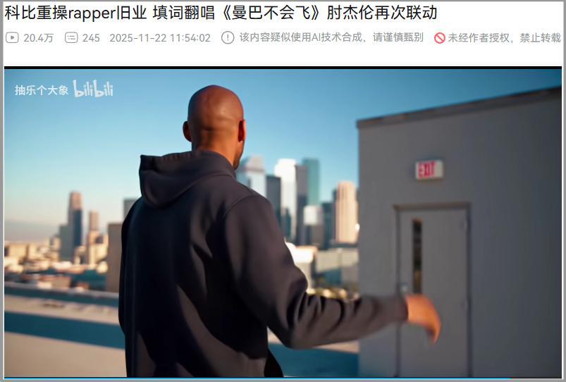 次元壁在AI面前薄如蟬翼,於是科比重拾rapper老本行,和周董隔空對唱《曼巴不會飛》。兩人都不得不面對巨星光環下的審視與重壓,但不要問他是否哭泣,因爲曼巴不能流眼淚。
