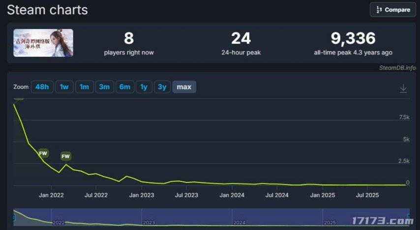 2021年買斷制的《古網》Steam海外版上線,雖然3天時間銷量就突破20萬份,但依舊是叫好不叫座,最高在線人數只有9000多,一年後在線人數就穩定在幾百人。
