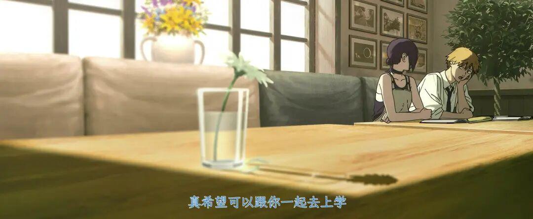 在那一幕的擁抱前,瑪奇瑪和電次同時流淚了,說明他們的底色其實是一致的,能打動他們的是同一件事。所以轉生成那由多的瑪奇瑪,開始親身體驗生命:與人擁抱、上學交友、喫學校便當……一切不再是無法觸碰的觀影視角。