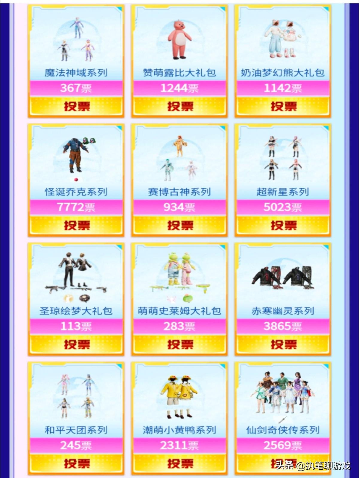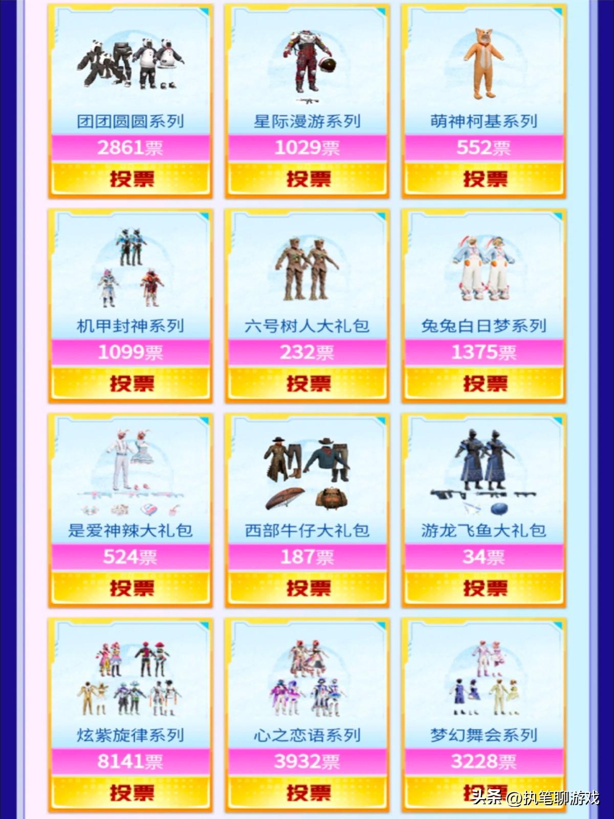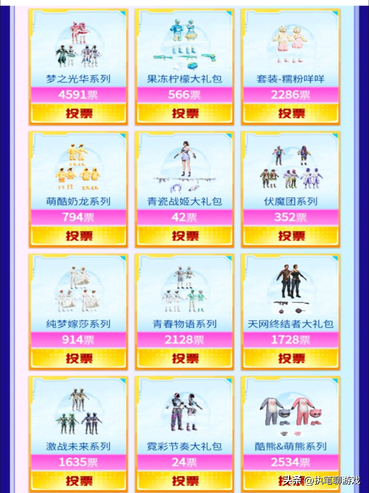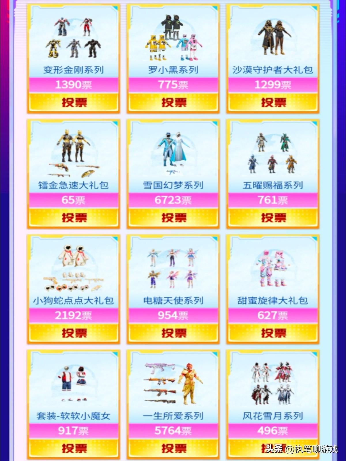 首先我們來看第一組名單,其中“雪國夢幻”已經將近七千的人氣,“一生所愛”將近六千的人氣,這8個不同系列裏,也有不少大禮包,比如小狗蛇點點等~在天哥看來呢,雪國是註定的“老成員”,而“一生所愛”系列則是因爲9級槍的原因,也會成功進入前36的名單。