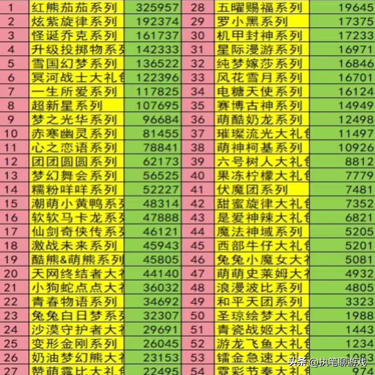 如圖所示,在這份人氣榜單裏,我們能看到54個不同系列的經典皮膚,人氣值也是一清二楚,前十名分別是紅熊茄茄、炫紫旋律、怪誕喬克、升級投擲物系列、雪國夢幻、冥河戰士、一生所愛、超新星、夢之光華、赤寒幽靈等。
