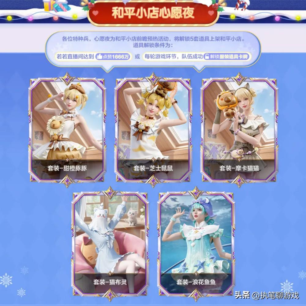 相比以往的和平小店來講,這一次最大的不同之處在於多了一個“心願夜”,此次將會出現甜橙豚豚、芝士鼠鼠、摩卡貓貓、貓布靈以及浪花魚魚等5套直售衣服。