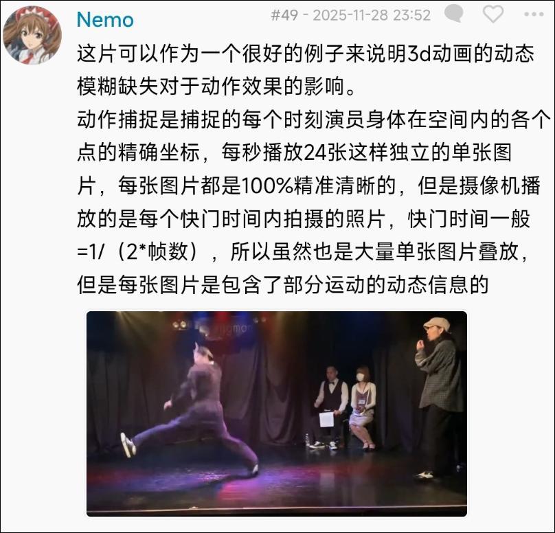 在 Bangumi 的論壇裏,有人提到《絕妙舞步》動作觀感不佳,可能有一部分原因是缺少動態模糊:很多大幅度、快速的動作因爲沒有“拖影”,看起來會帶一點突兀的“瞬移感”,反而削弱了舞蹈該有的力度與連貫。