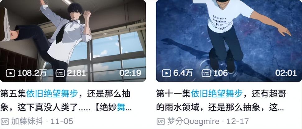每有動畫更新,幾家視頻平臺都會出現專門截動畫舞蹈片段的切片,給這些片段配合上經典的BGM《That Girl》,套上“第×集依舊絕望舞步,還是那麼抽象,這下真沒人類……”的標題,一眼望上去,全都是查重率99%的參考文獻。