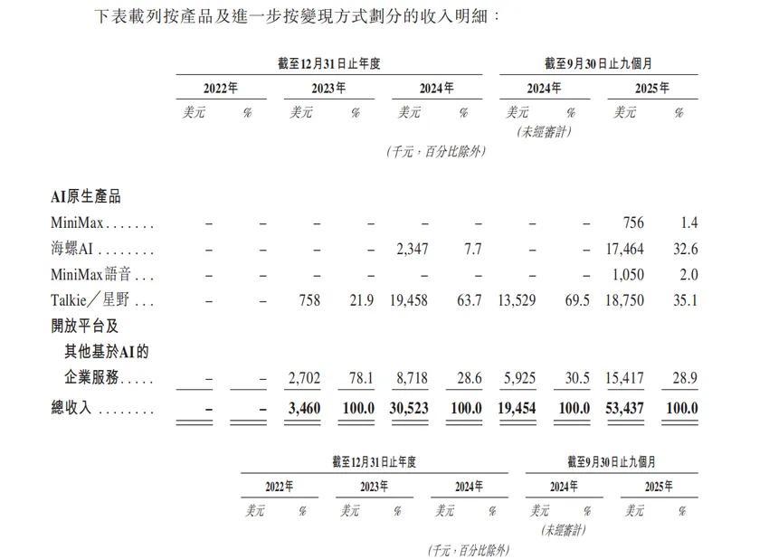 2025年前9個月,MiniMax的AI原生產品收入超3800萬美元(約合2.67億元),佔總收入的71.1%;而在2023年時,AI原生產品收入只有約76萬美元(約合535萬元),兩年間猛增50倍。