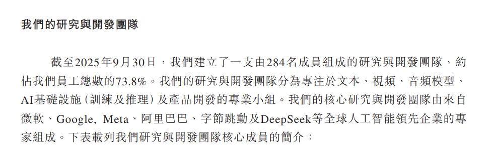 在團隊方面,招股書中提到,公司研發團隊約385人,研發人員佔比近74%,分爲專注文本、視覺、音頻、AI基礎架構(訓練和推理優化)及產品開發的專業小組。核心研發團隊由來自微軟、谷歌、Meta、阿里巴巴、ByteDance及DeepSeek等企業的專家組成。