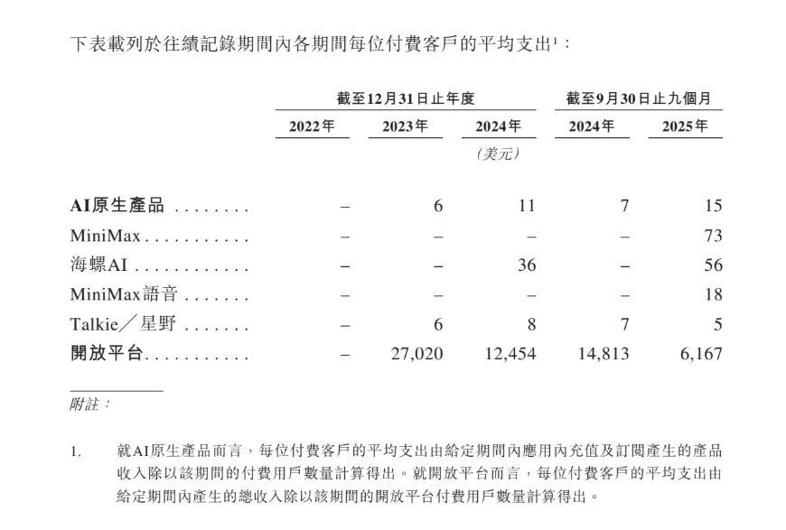 有意思的是,MiniMax的智能Agent應用雖然用戶基數較小,但人均付費能力極強。2025年前九個月,其每位付費客戶的平均支出高達73美元,遠超Talkie星野的5美元,體現了MiniMax在AI領域生產力工具的高商業溢價。