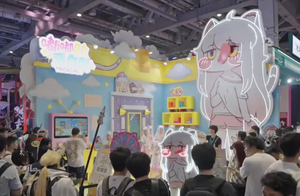 先來說說線下部分。在今年的BW(Bilibili World)漫展上,各家廠商都在拼命搭建華麗的展臺、邀請知名Coser站臺,以此展示產品的高級感。而《嘟嘟臉惡作劇》的展區卻顯得格格不入——他們直接搬來了一個巨大的、滑稽的大舌頭裝置。